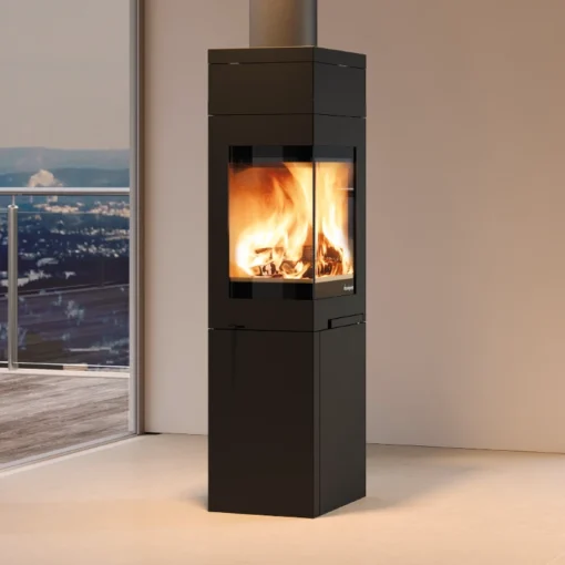 Die verbaute Panoramaglasscheibe ist L-förmig über Eck und bietet Ihnen einen außergewöhnlichen Blick auf das Flammenspiel. Die Verbrennungsluft wird über den Einhandregler an der linken Seite eingestellt. Durch ein zusätzliches Zuluftkit und dem serienmäßig verbautem Frischluftstutzen ist der Holzofen auch für den raumluftunabhängigen Betrieb mit externer Verbrennungsluftzufuhr zulässig.